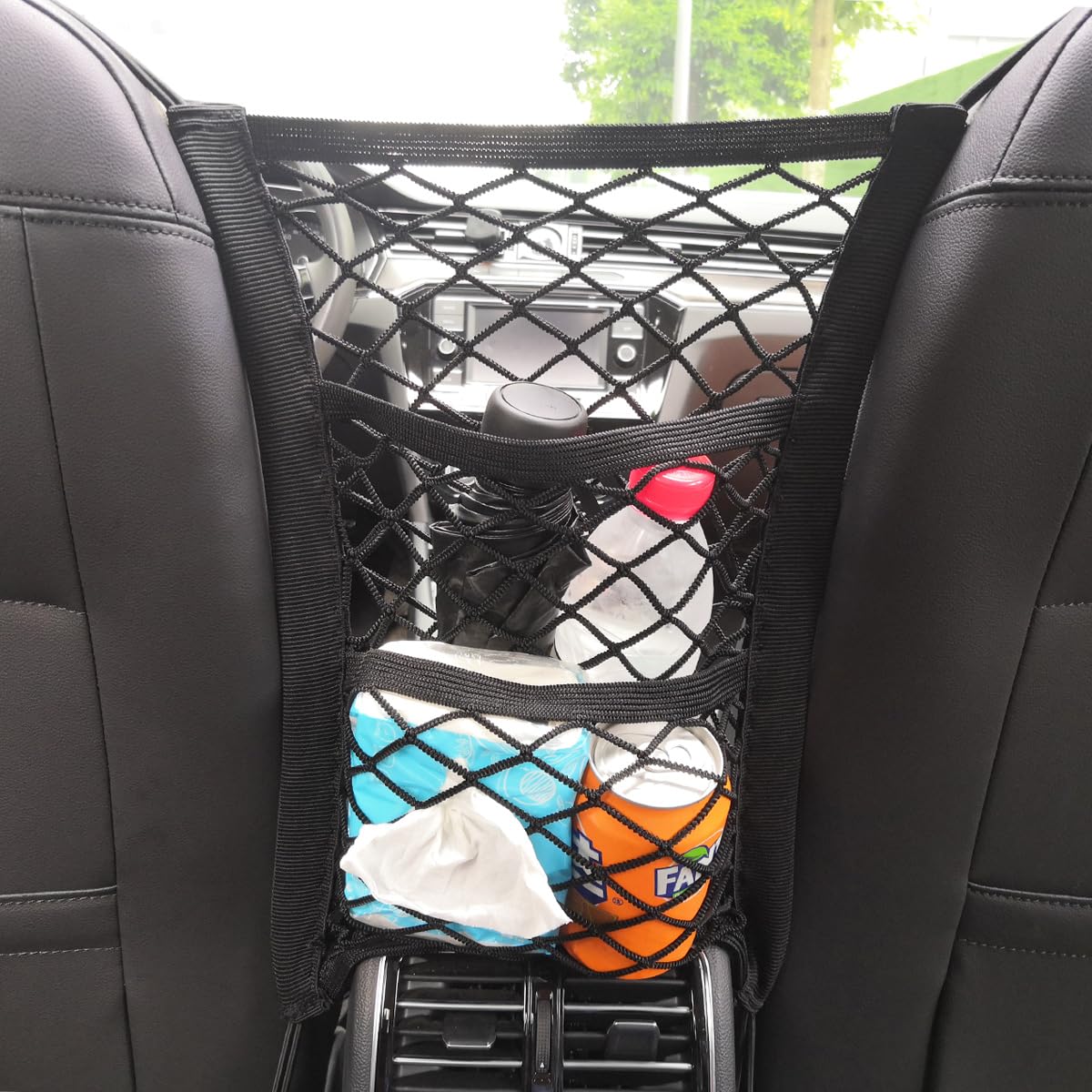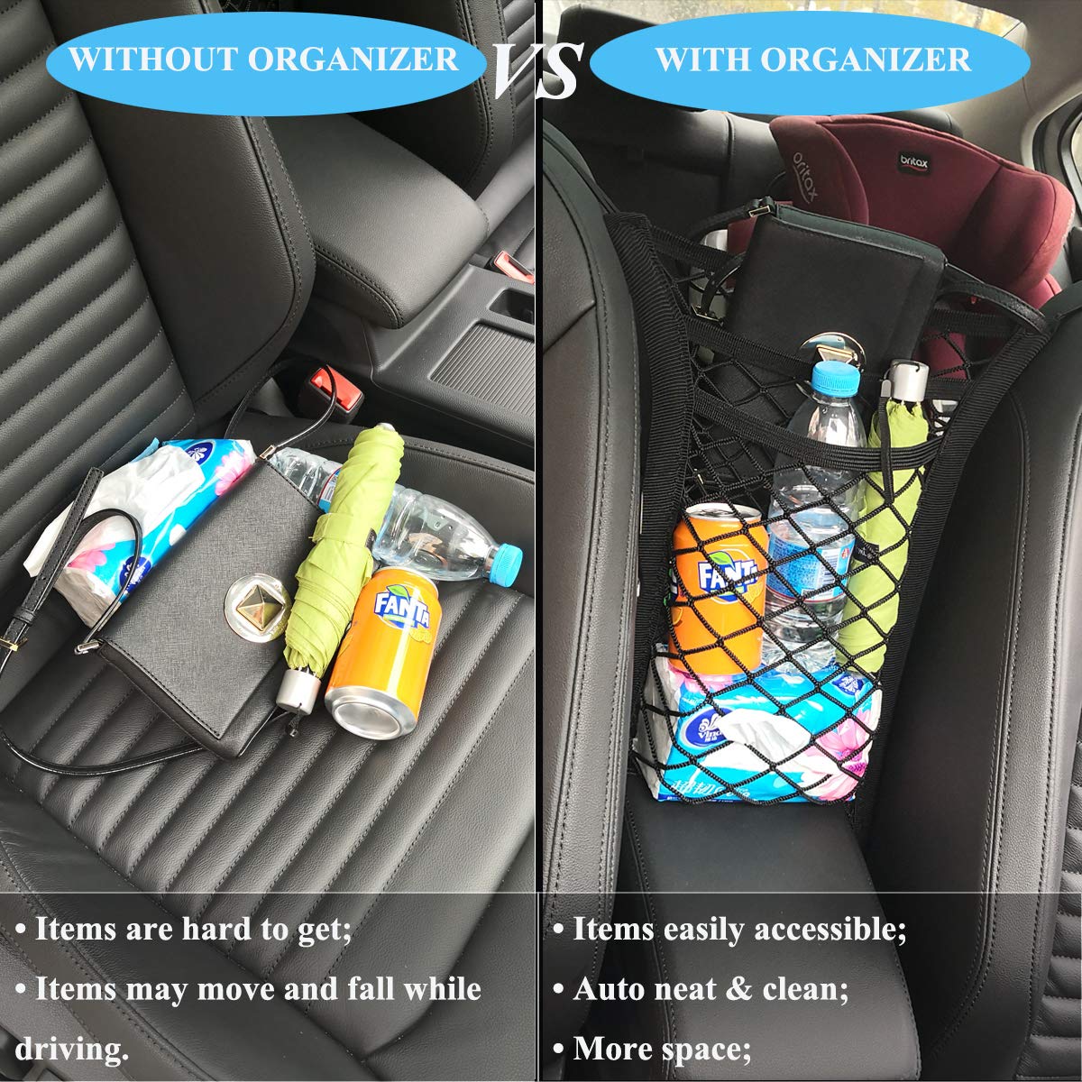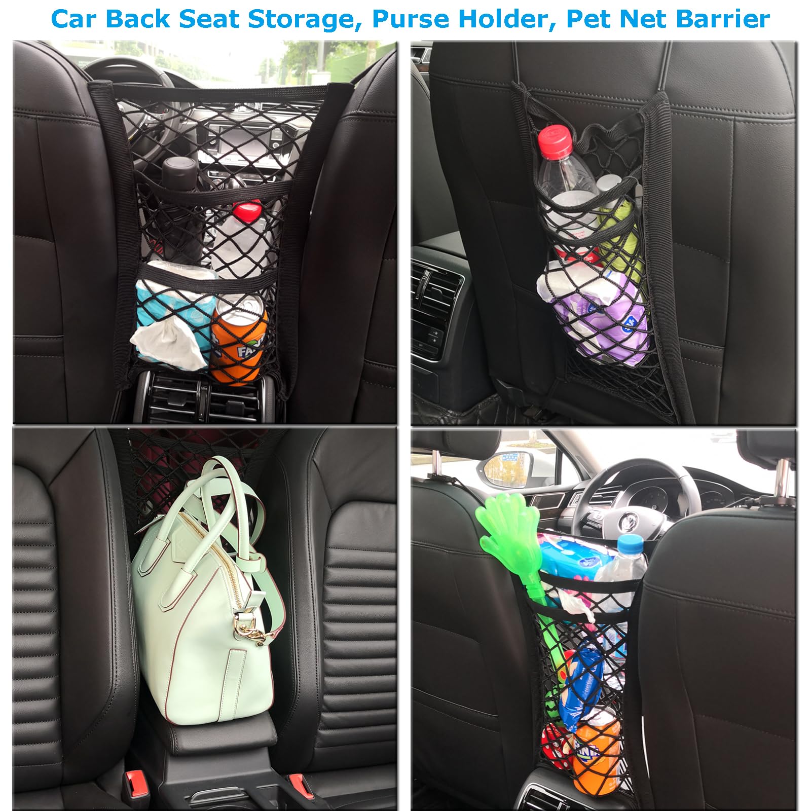 - As Car Mesh Organizer – This car net bag will keep small items in order, such as phone, book, purse, snacks, drinks, toys, umbrella, and tissue etc. As a mesh hammock-style car pocket handbag holder, which can keep your purse or handbag within reach and without it falling back!