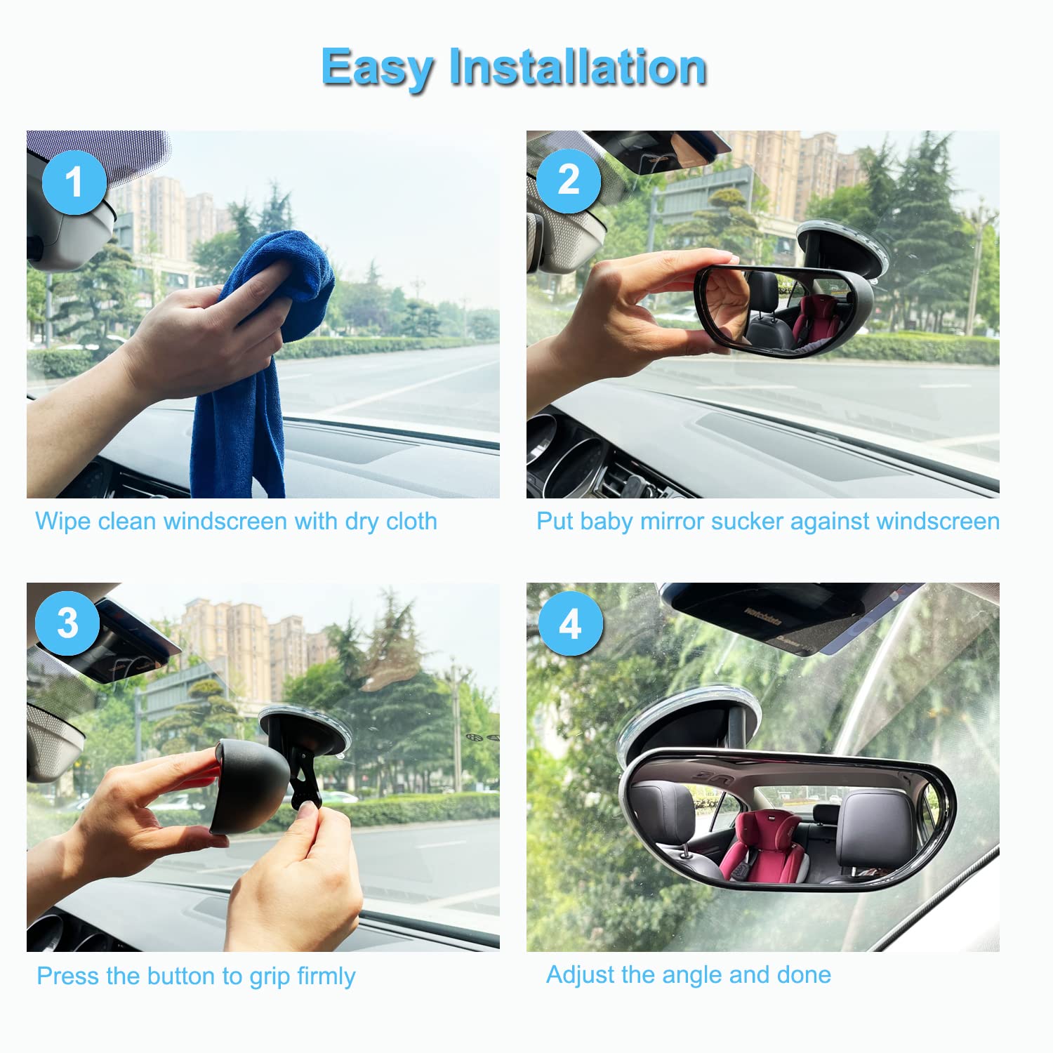 - EASY TO INSTALL CAR BABY MIRROR – Effortlessly install this car baby mirror onto any smooth & clean windscreen within 1 minute, it will grip firmly and won’t move. This baby car mirror won’t leave you any mark when detached.