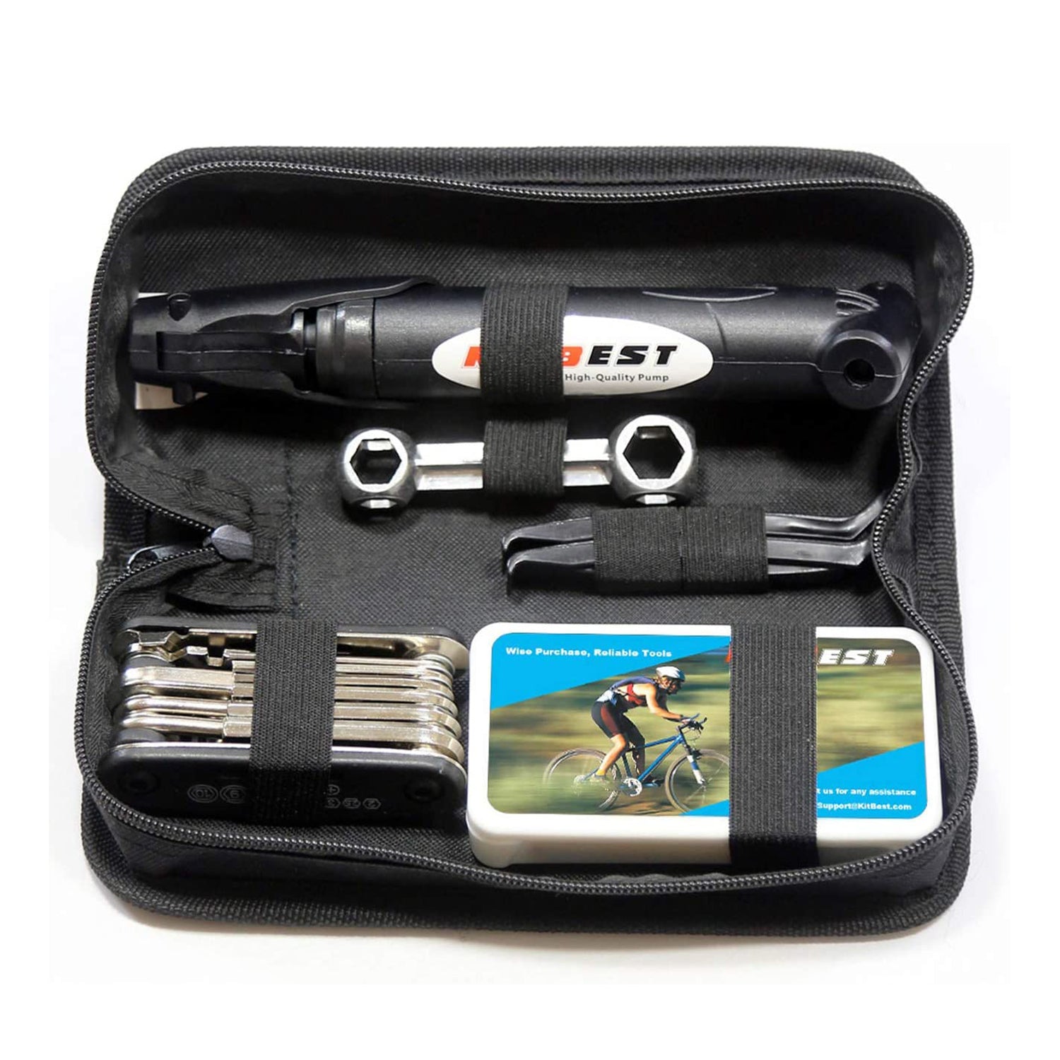 - Bike Tool Kit Set – KITBEST bike repair kit includes a Mini Bike Pump (fit for Presta & Schrader Valves), Bike Multitool, Bike Patch kit, Metal Rasp, Bike Tire Levers, Bone Hexagon wrench and bike bag. It is a must have bicycle kit, bike tool kit, bike tire repair kit, bicycle tool kit, bike repair multitool and mountain bike accessories.