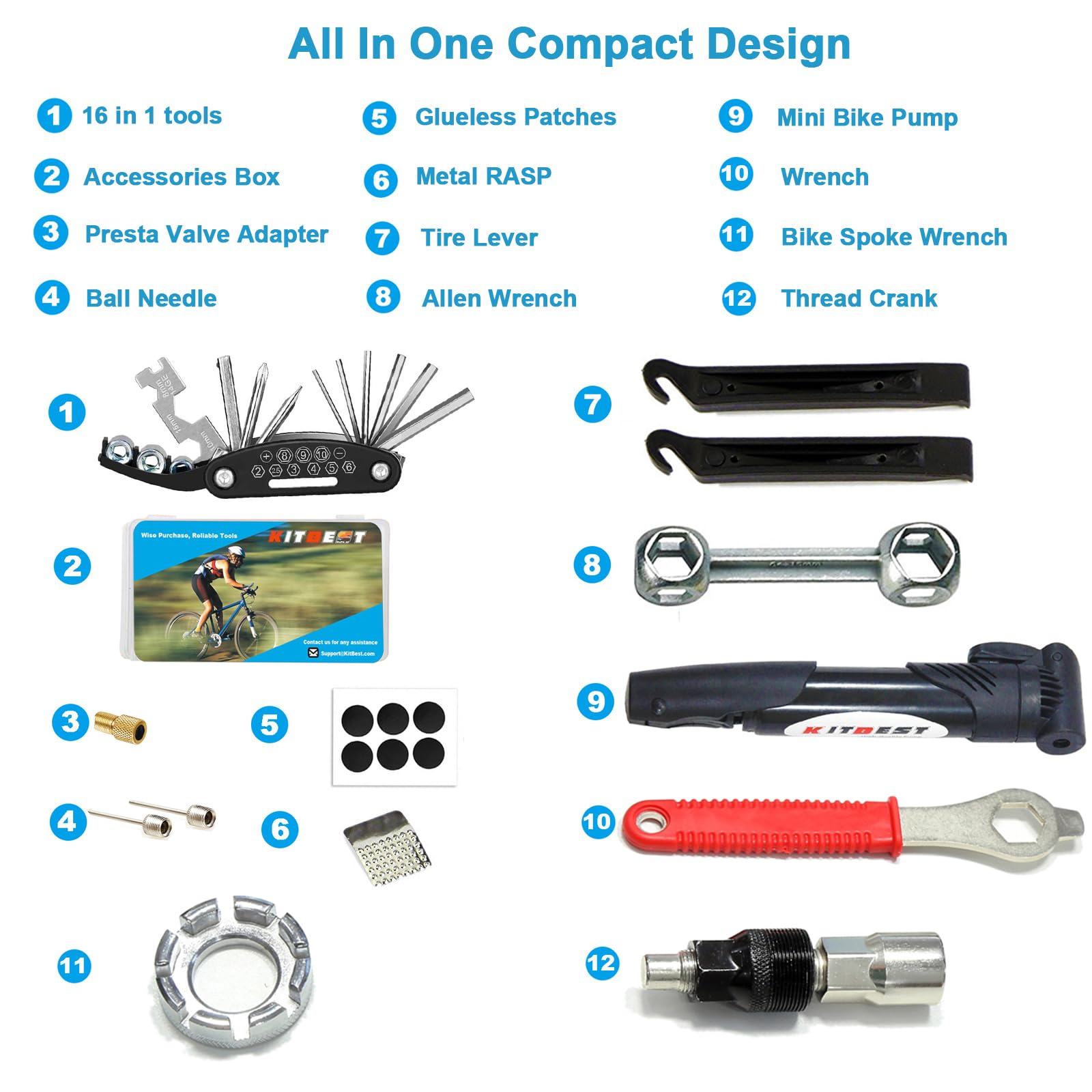 - Essential Convenient Bicycle Indoor and Outdoor Tire Repair – bike repair kit with pump and bag, bike tube repair patch tool kit, emergency All in One bike multi tool are all great cycling kits, bike maintenance kits and bicycle accessories for men women.