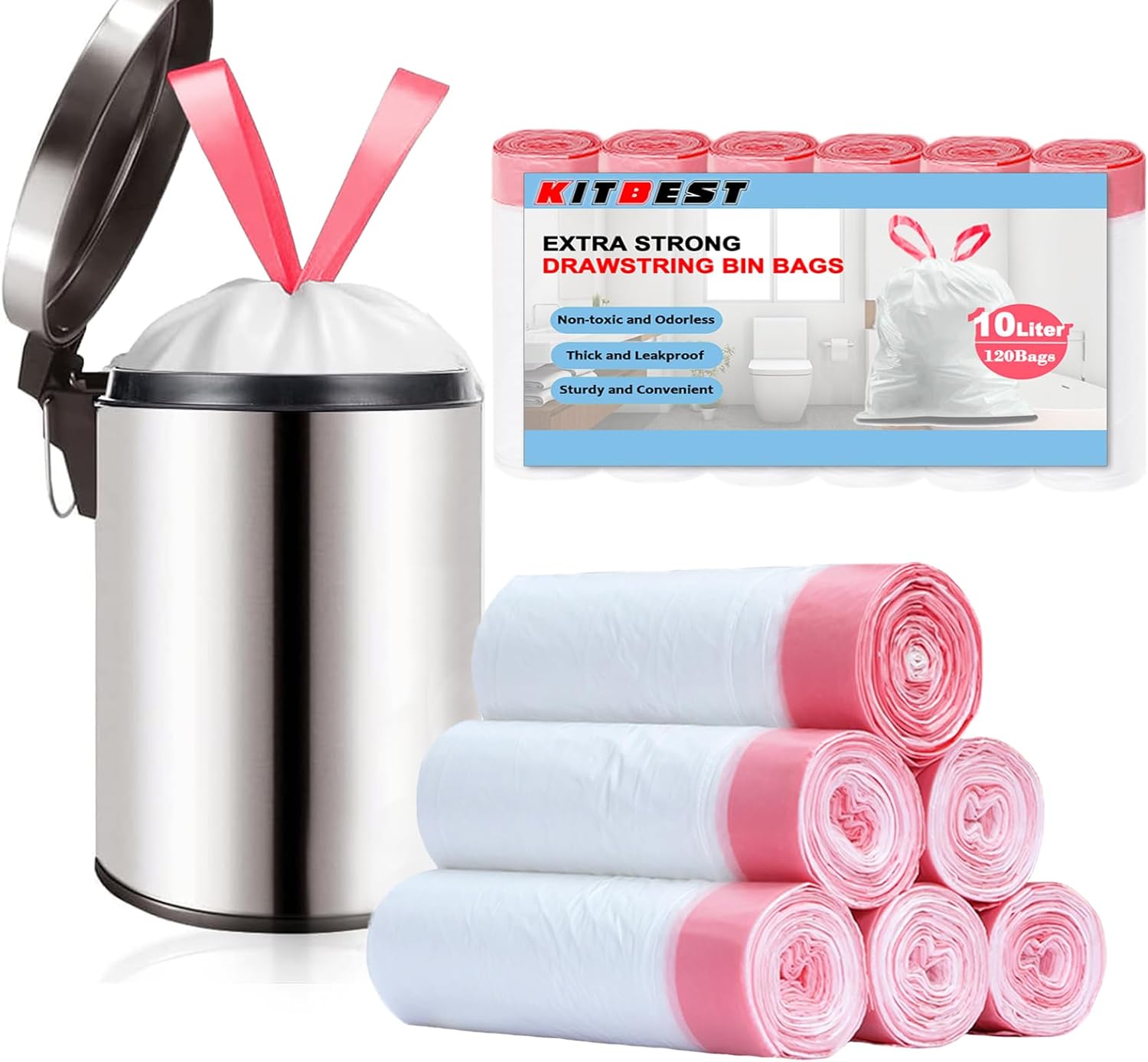 10L Bin Bags Small Bin Liners (120 Bags), Drawstring Trash Bags with Tie Handle, KITBEST No-Tear Caddy Liner Pedal Garbage Bags for Bathroom, Toilet, Kitchen, Office Waste Bin (45x50cm)
