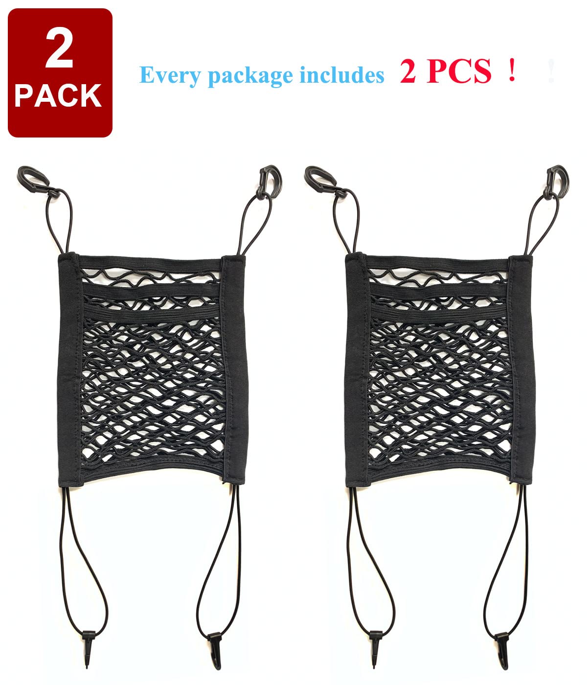 - COMES WITH 2 PCS OF CAR MESH ORGANIZERS (others has only one!) – Excellent addition for storage keeping small items in order, such as phone, book, purse, snacks, drinks, toys, umbrella, and tissue etc. Also a car net bag keeping your purse or handbag within reach and without it falling back!