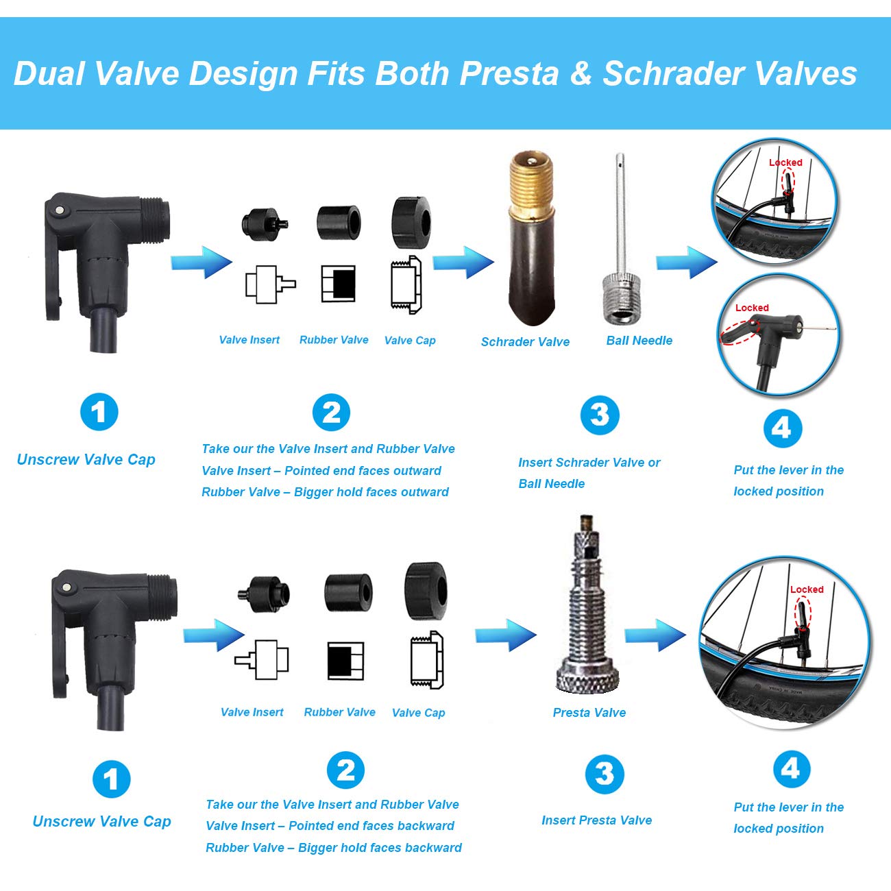 - Dual Valve Design - This dual valve bike pump is perfectly designed, with a convertible valve head which can be easily switched to fit both Presta and Schrader valve in a second.