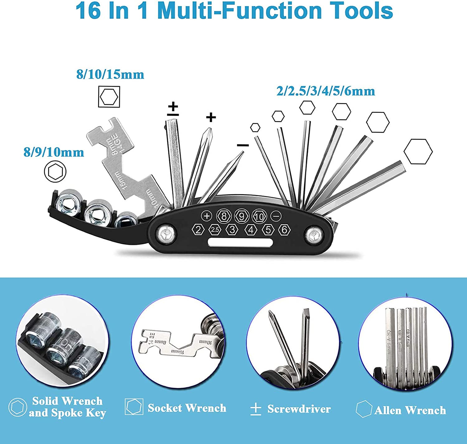 - Fahrrad Multifunktionswerkzeug – Unser 16 in 1 fahrrad multitool besteht aus Chrom-Vanadium-Stahl, ist langlebig und korrosionsbeständig. Dieses Fahrrad-Multitool enthält 2 | 2.5 | 3 | 4 | 5 | 6, Innensechskantschlüssel (mm): 8 | 9 | 10 und eine Stecknuss-Verlängerungsstange, Flachschlüssel (mm): 8 | 10 | 15, Spoke 14GE, Schlitz- und Kreuzschraubendreher, kompakt und leicht zu transportieren, unterstützt Sie bei jeder Radtour.