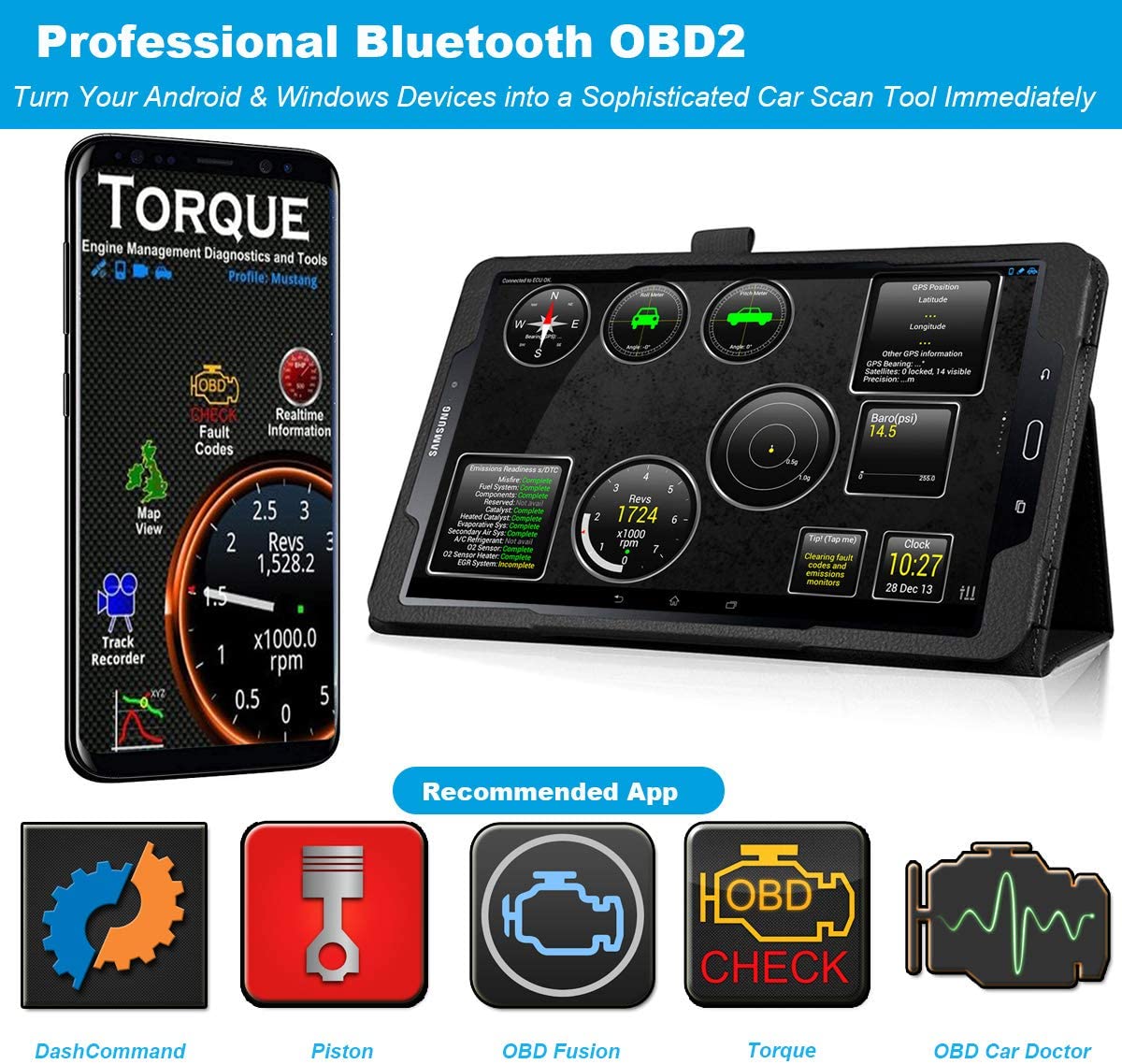 - Support Multiple Apps - A 3rd OBD2 App is required, choose from many OBDII Apps like Torque Pro, OBD Fusion, Car Scanner ELM OBD2, DashCommand, OBD Car Doctor, etc (More Bluetooth OBD2 Apps available on Google Play)