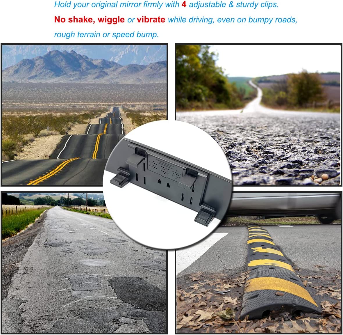 - Anti Shake –No shake, wiggle or vibrate while driving. It firmly holds the original car mirror to avoid shaking or falling off even on bumpy roads. Furthermore, its anti-splash design can prevent broken glass flying out of the frame to hurt you or passenger even if the mirror cracks in accident